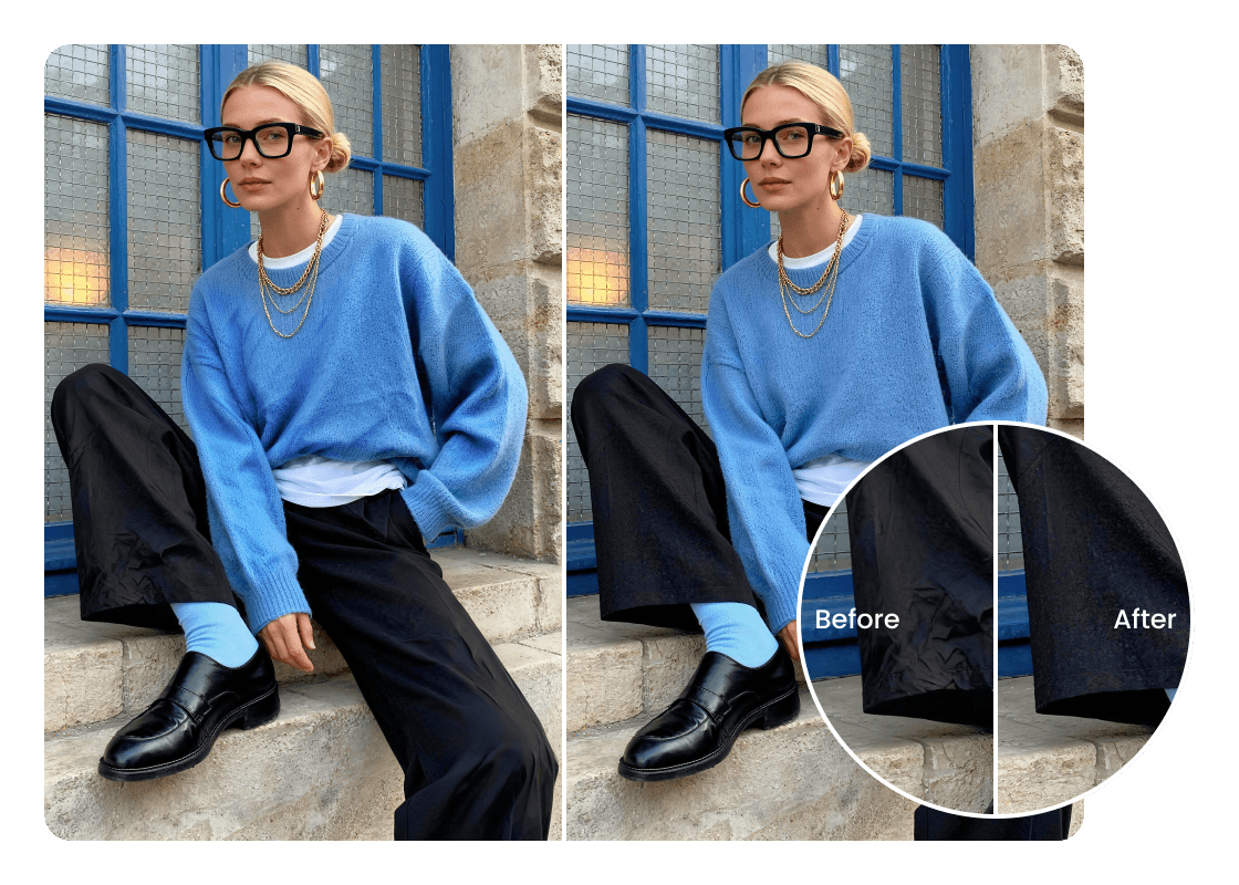 Im Modus „Knitterfalten“ erkennt und entfernt die KI sofort Knitterfalten in der Kleidung, sodass ein gepflegtes, elegantes Aussehen entsteht