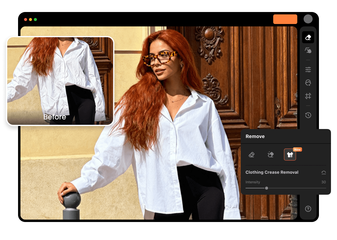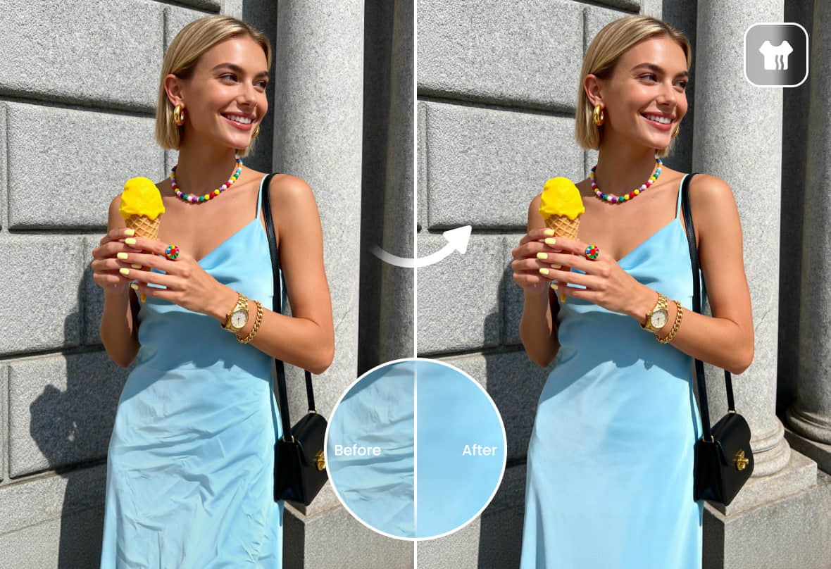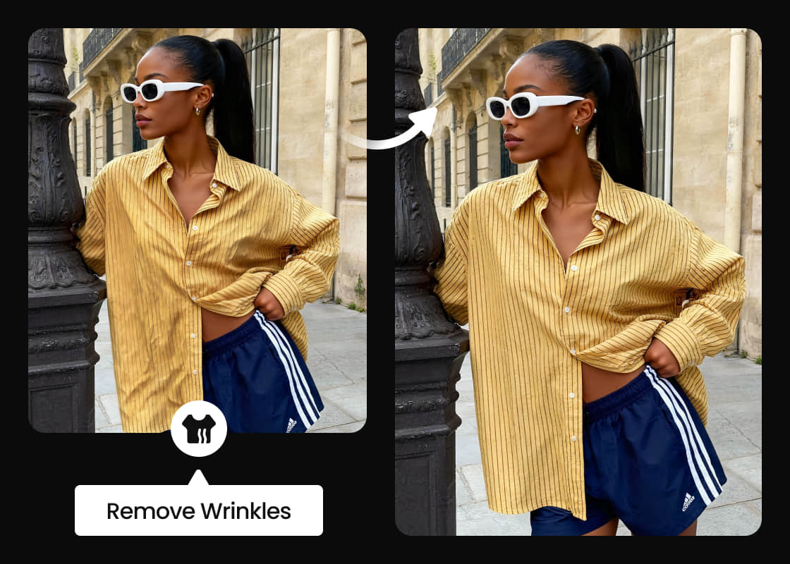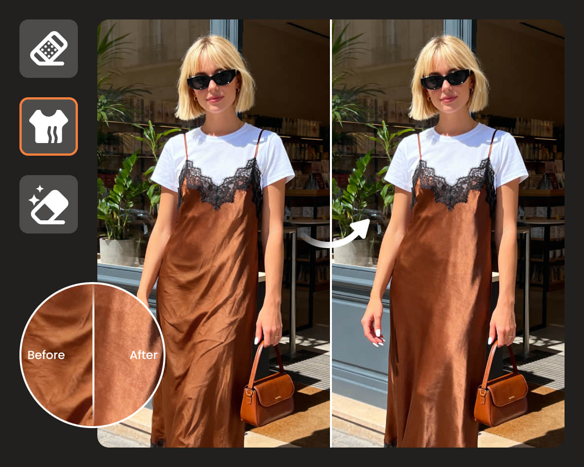 Sie haben ein tolles Foto gemacht, aber bemerken Knitterfalten auf Ihrer Kleidung? Sie müssen das Foto nicht erneut aufnehmen! Mit Airbrush können Sie Knitterfalten in Ihrer Kleidung ganz einfach online und kostenlos entfernen und Ihr Outfit in jeder Aufnahme glatt, gepflegt und makellos aussehen lassen.