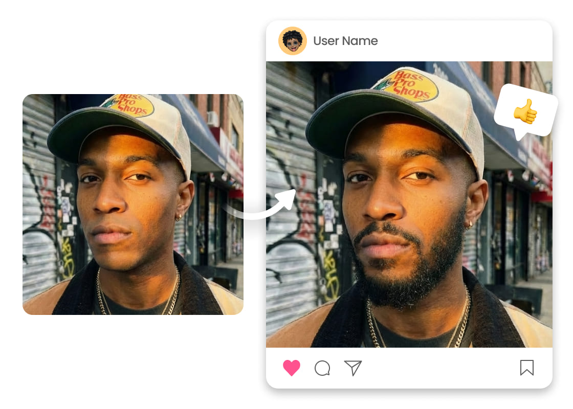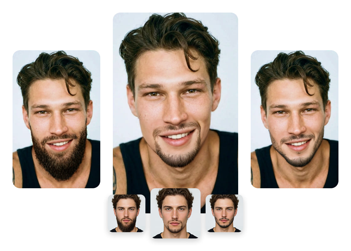 Наложить бороду на фото поможет ИИ-фильтр бороды от Airbrush. Выберите стиль, скорректируйте образ и получите реалистичный результат, безупречно вписывающийся в фон. Он идеально подходит для быстрых преображений, фото профиля и примерки нового стиля.